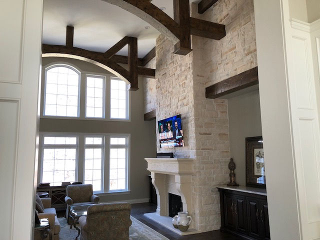 The great room was a major transformation with the addition of stone on the walls and custom wood beams.